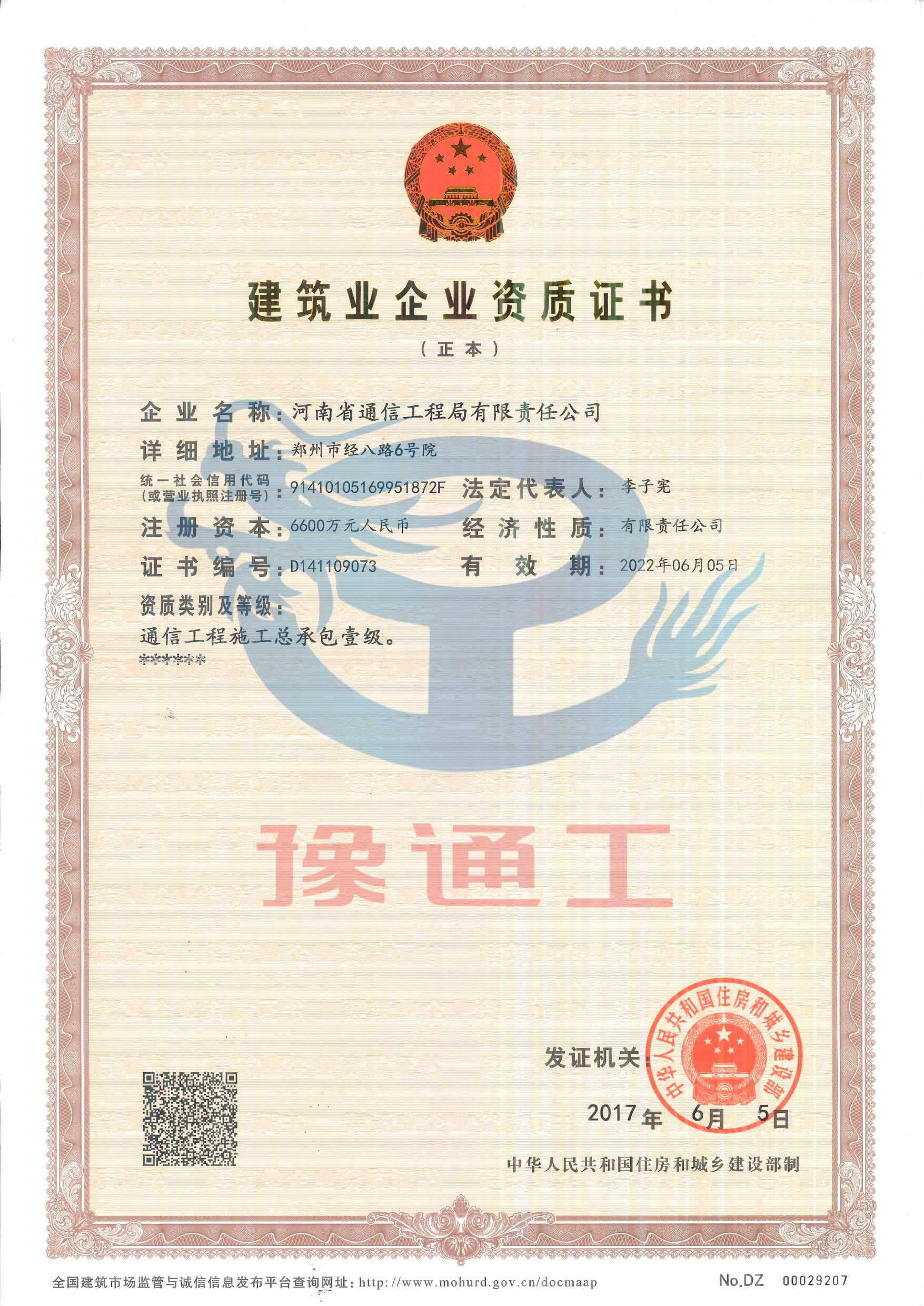 電子與智能化、建筑裝修裝飾、消防設施工程專業(yè)承包壹級;鋼結構工程專業(yè)承包貳級;建筑工程、電力工程、機電工程、城市及道路照明工程專業(yè)施工總承包叁級;施工勞務不分等級。